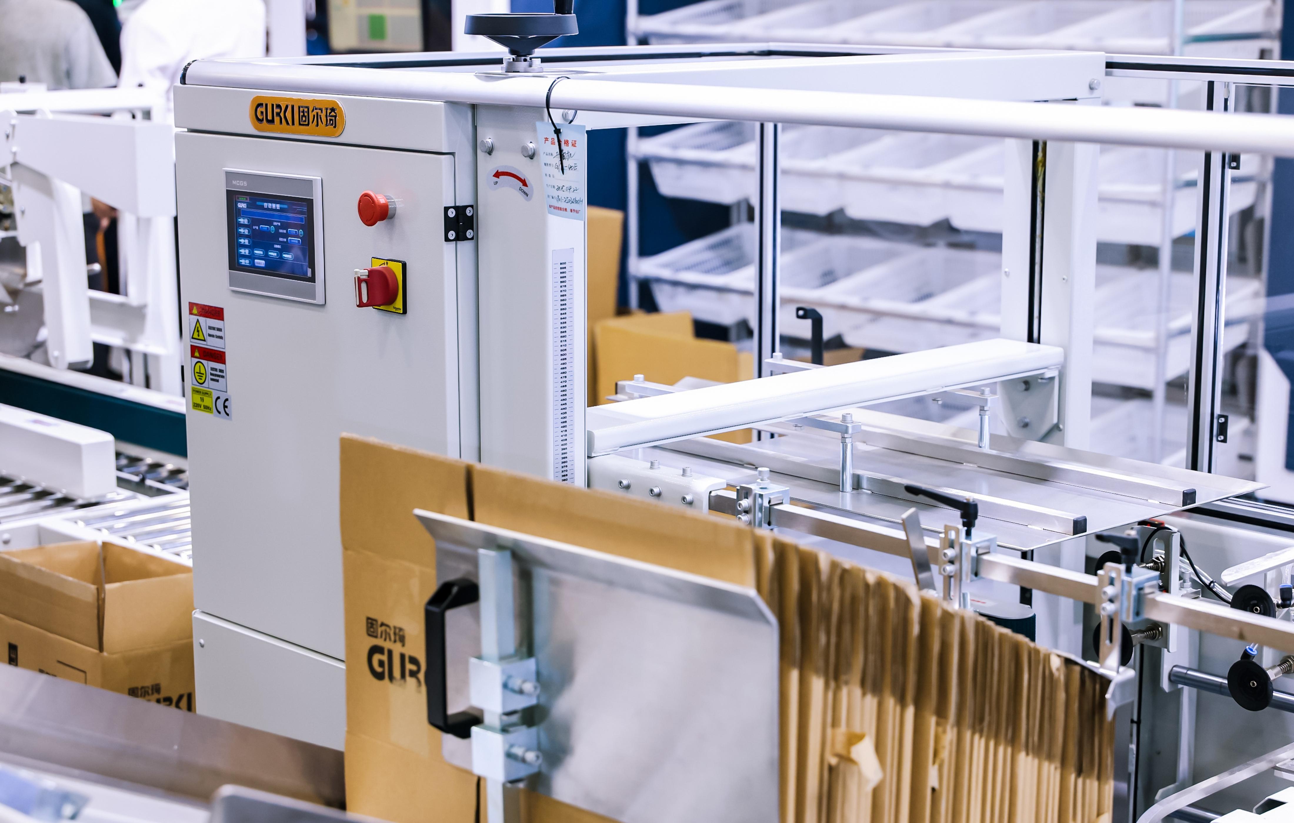 自動折蓋封箱機GPC-50:雙立柱式結構,確保機器能夠高速運轉,高效穩定作業,封箱平整度提升50%,速度可達 600 箱/小時。