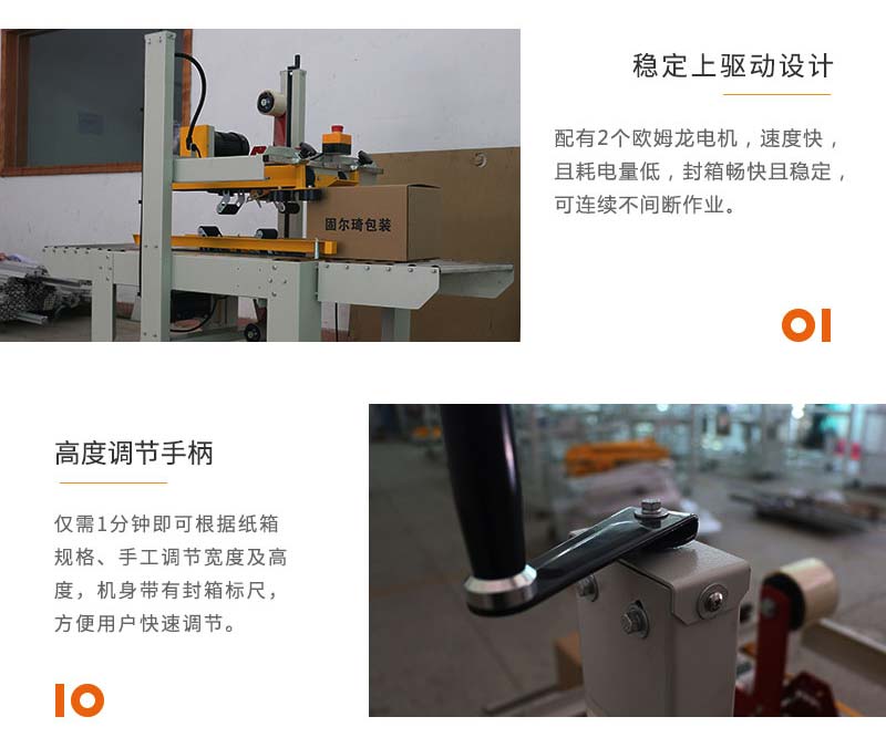 上下驅動封箱機上下皮帶驅動,適合輕型高箱;可同時對紙箱進行上下 “一”字型封箱,上下封箱平穩(wěn)、快速,適用于較輕較窄紙箱。 該款封箱機廣泛應用于食品、醫(yī)藥、飲料、煙草、日化、汽車、線纜、電子等行業(yè)。