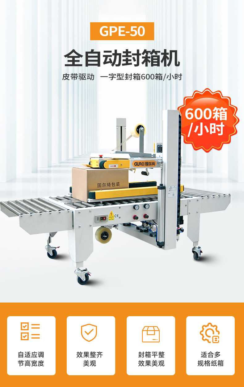 全自動(dòng)封箱機(jī)GPE-50可以自動(dòng)調(diào)節(jié)紙箱高度及寬度,更換不同規(guī)格紙箱無需人工調(diào)節(jié);推薦更換紙箱規(guī)格頻繁的用戶使用。該款封箱機(jī)廣泛應(yīng)用于食品、醫(yī)藥、玩具、煙草、日化、電子等行業(yè)。