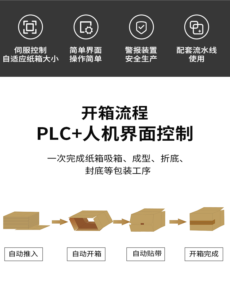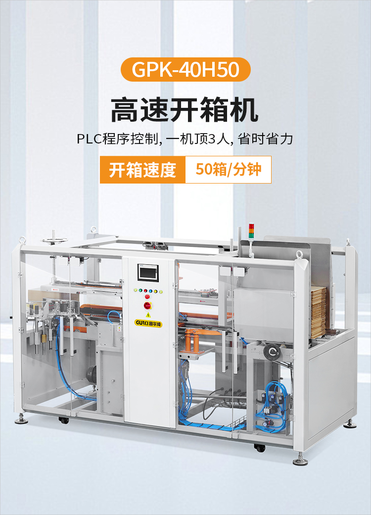 高速開箱機(jī)GPK-40H50是本公司自主生產(chǎn)設(shè)計(jì)的產(chǎn)品,臥式開箱速度達(dá)到50箱/分鐘的高速開箱機(jī),高性價(jià)比配置,使用壽命長,經(jīng)濟(jì)實(shí)惠。 該款開箱機(jī)廣泛應(yīng)用于食品、醫(yī)藥、飲料、煙草、日化、電子等各行業(yè)。