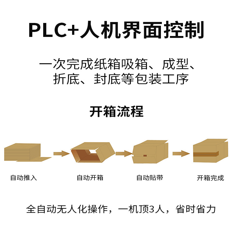 全自動伺服開箱機是一款支持多種規格開箱設備,設置立式料槽,儲料更多,大大節省了紙箱更換調節問題;整機采用電眼自動感應、伺服控制和驅動設計,開箱速度更快更穩,加裝安全防護門,開門即可換膠帶,更方便,省心;同時,整機采用嚴格的生產工藝零部件和伺服驅動開箱,速度達12箱/分鐘,自動吸取紙箱并成型,并加裝了斷膠帶、無膠帶自動報警提示功能,該款開箱機已廣泛用于食品、醫藥、飲料、煙草、日化、電子等各行業。