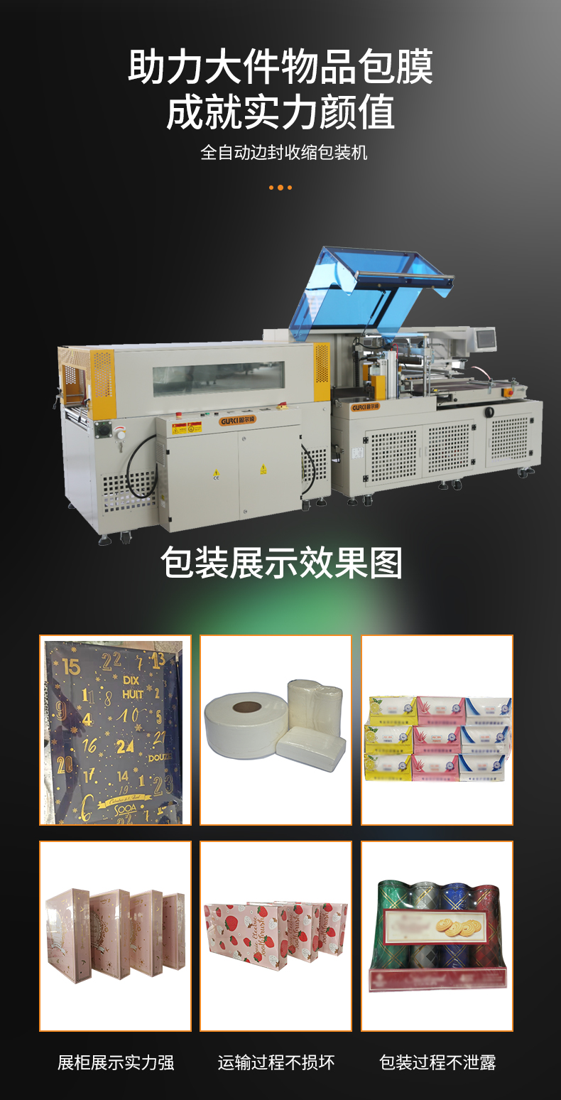 全自動邊封收縮包裝機是一款非標定制產品,整機配有PLC程序系統,采用光電對產品進行自動偵測,根據產品自動調節送料長度,自動對產品進行封切收縮,檢測開關控制電機自動卷收廢膜。從而實現無人化自動包膜的特點,該機工作效率高,針對不同大小的產品,速度為每分鐘1-20件,該款封切收縮包裝機也適用于印刷、彩盒、醫藥、日化、汽配、食品等行業。