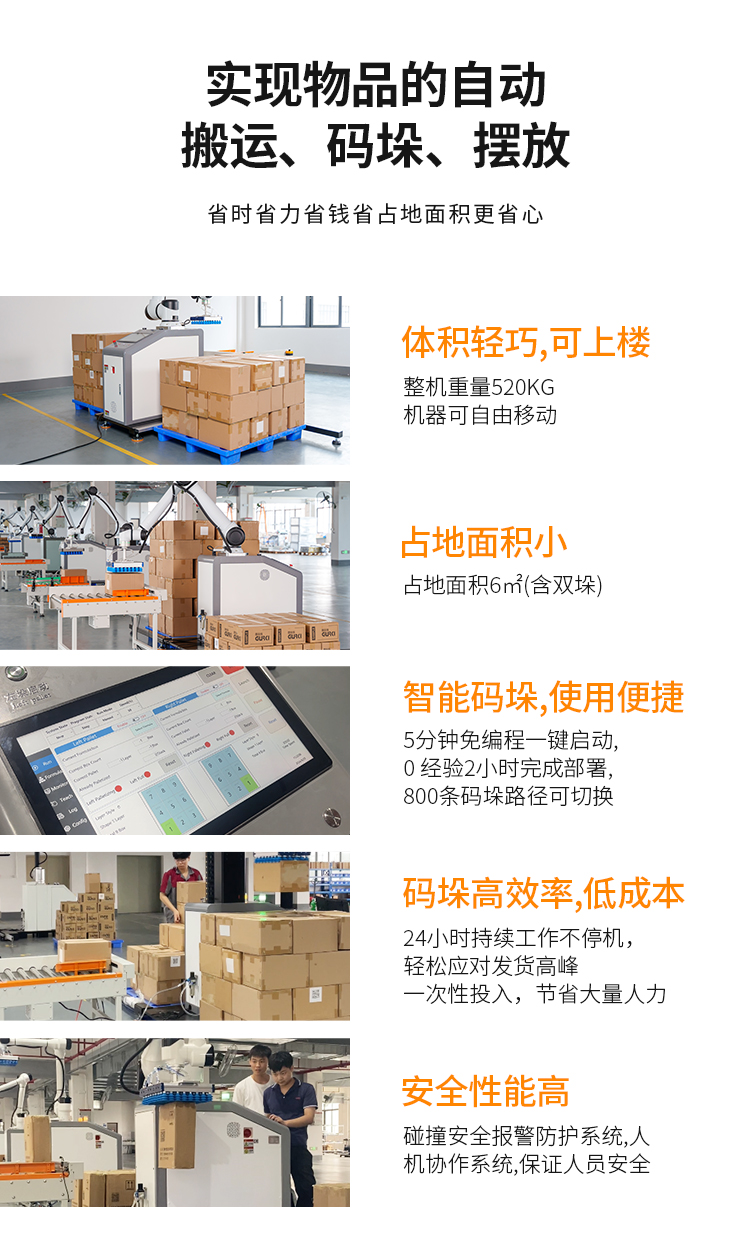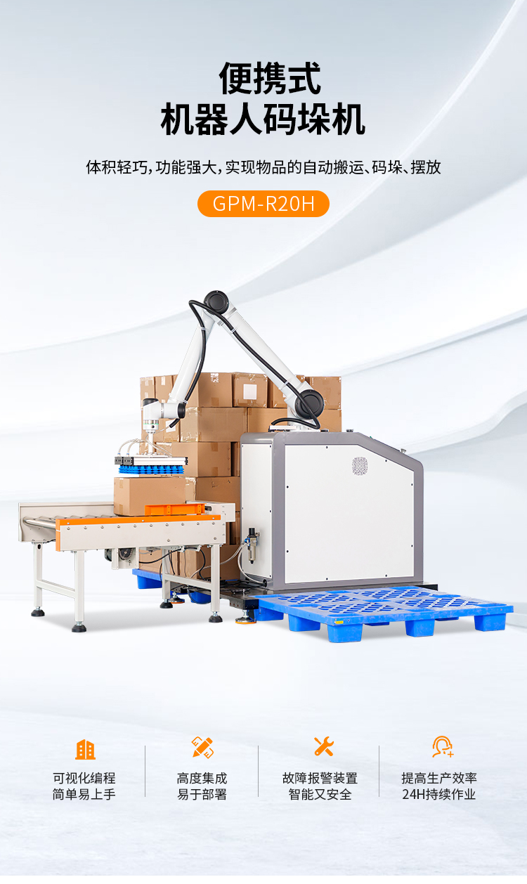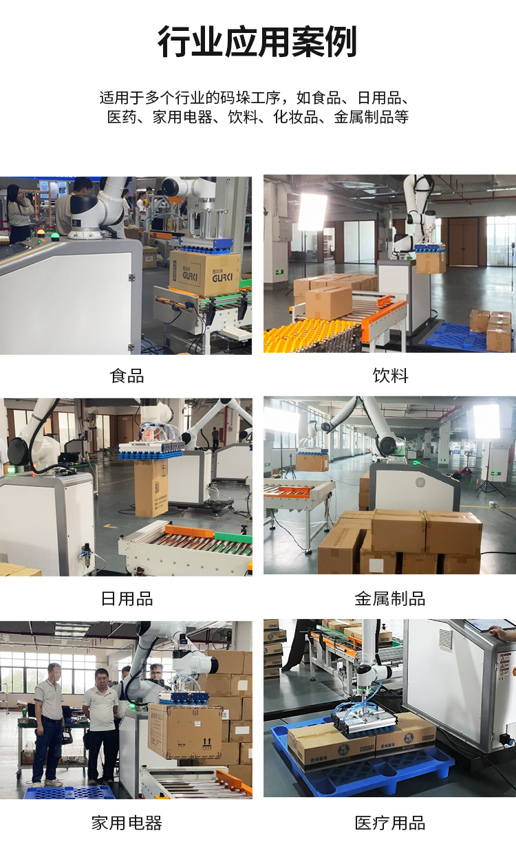 隨著國內(nèi)人口紅利逐漸消失,推動現(xiàn)代化、自動化裝備進入生產(chǎn)產(chǎn)線,代替人工從事高強度、高重復度工作,有利于企業(yè)降本增效和產(chǎn)業(yè)轉(zhuǎn)型升級。在食品飲料、物流倉儲、醫(yī)藥化工等行業(yè)存在大量碼垛需求,一站式碼垛工作站: 具有快部署、免編程、易使用、高效率、性價比高等優(yōu)勢,是滿足各類碼垛應用場景的優(yōu)選、智選。