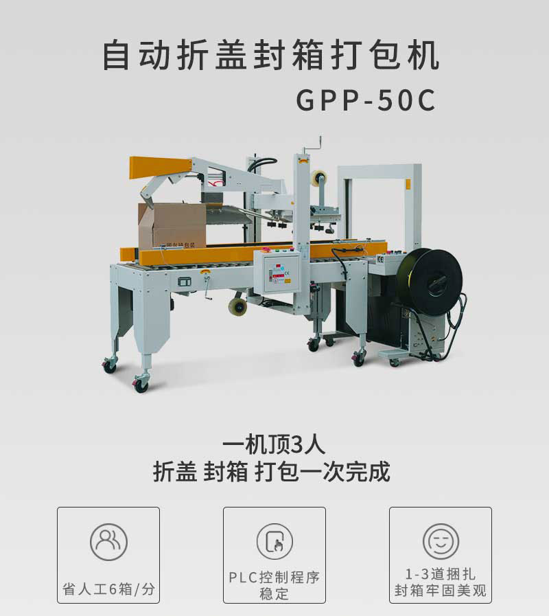 自動(dòng)封箱打包機(jī)GPP-50C+GEQ-200H的配套,是一種集自動(dòng)封箱及捆扎為一體的包裝 機(jī),可配套自動(dòng)化包裝流水線使用,自動(dòng)折蓋、上下封膠帶、多道捆扎, 實(shí)現(xiàn)后道無(wú)人化包裝,工作效率高,快速,平整,美觀工作效率,高更好 滿足新老顧客的需求。廣泛適應(yīng)于印刷、彩繪、賀卡、相 冊(cè)、相框、醫(yī)藥、電子、日化、化妝品等大批量生產(chǎn)的行業(yè)。