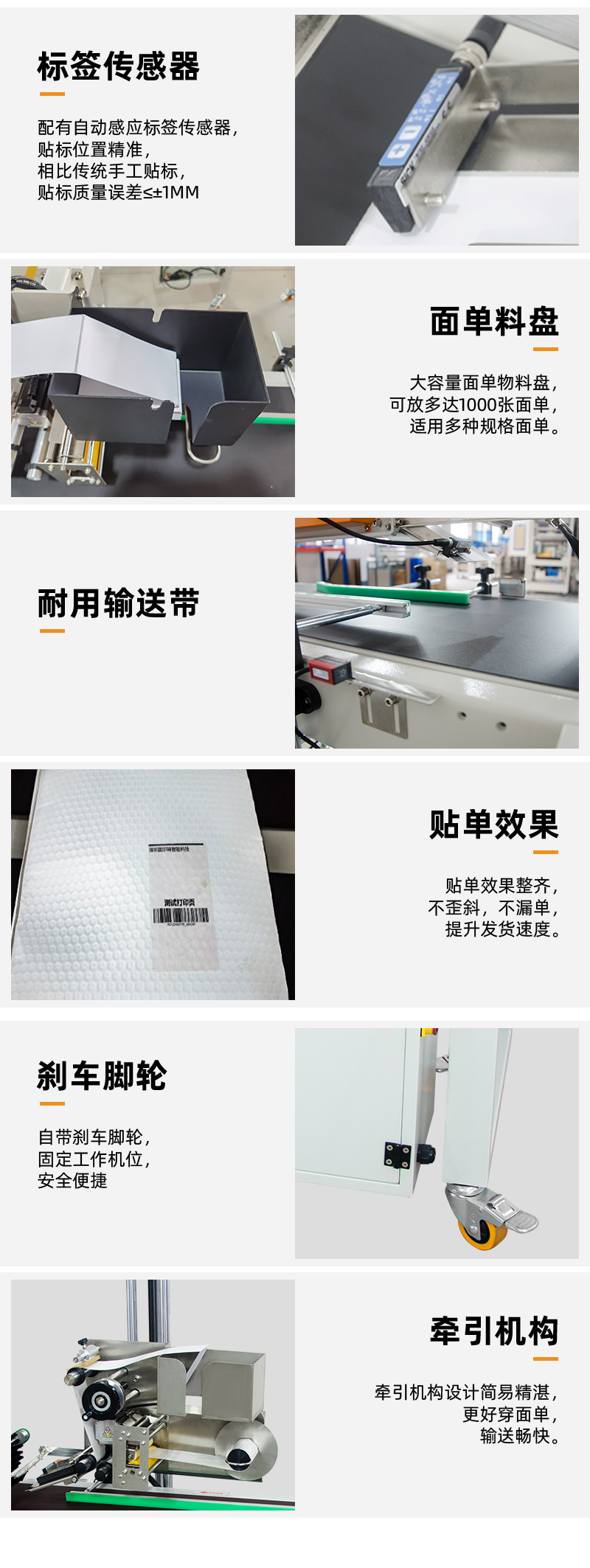 自動快遞貼單機是我司自主設計生產(chǎn)的一款24小時無人化連續(xù)貼單作業(yè)的設備,該機具有一鍵啟動,傻瓜式操作的特點,日貼3萬+,操作使用體驗更好。同時,該機針對信封等較薄的證件貼面單,設有光纖傳感器,方便更加快速貼單,適用于貼各種規(guī)格的大小紙箱、快遞面袋等,可實現(xiàn)打印快遞面單后,產(chǎn)品一邊輸送一邊貼單,貼單平實、貼單位置精準,不傾斜,精度誤差≤±1mm。可單機使用也可配套封箱機使用,廣泛應用于倉儲、物流、電商等行業(yè)。